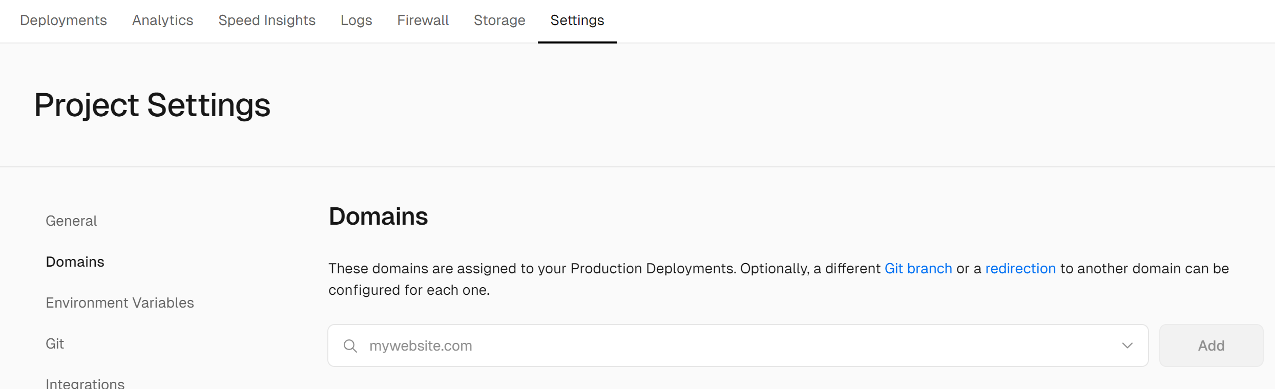 如果想要使用自己的域名,可以在 Vercel 中添加域名,并在域名供应商处进行相应的 DNS 配置。